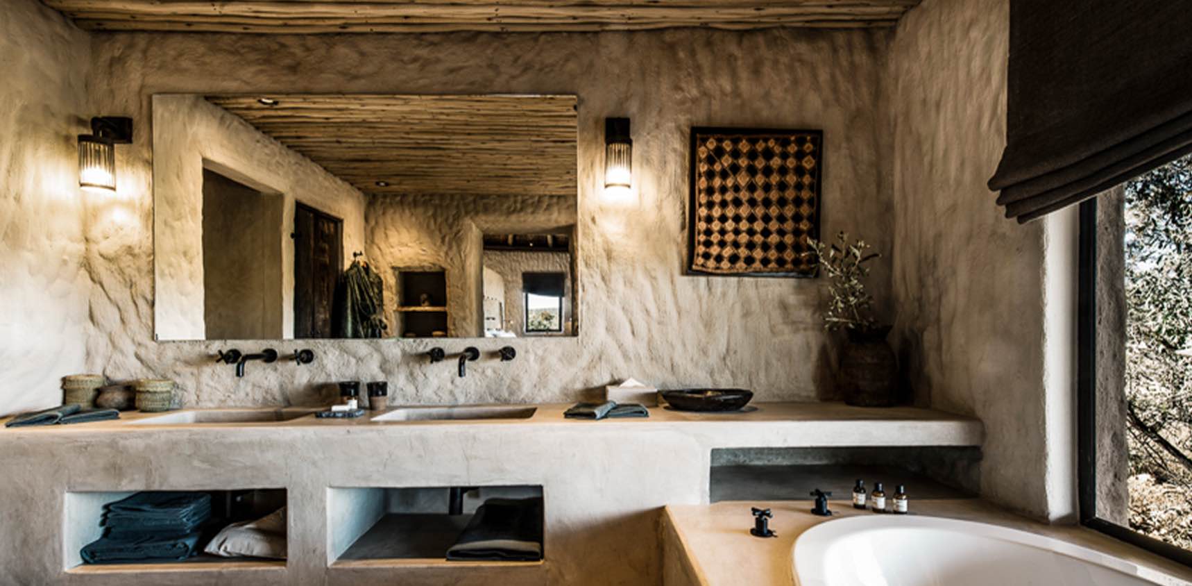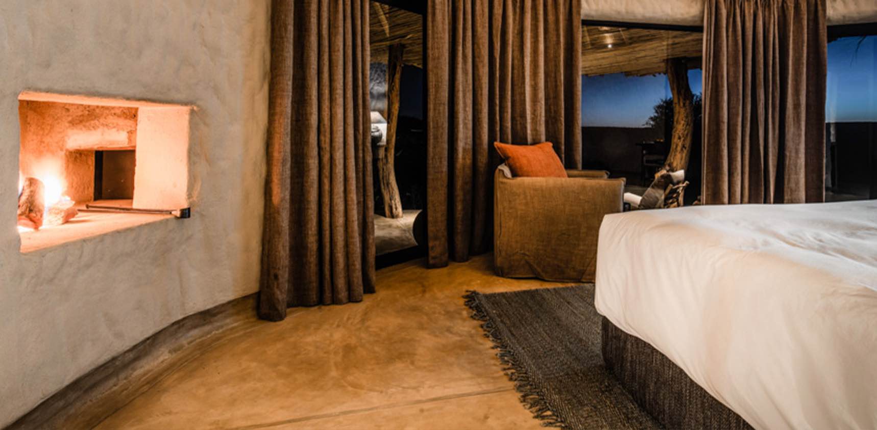 Nos trois huttes de deux chambres sont spécialement conçues pour les familles ou les amis voyageant ensemble, avec de grandes terrasses parfaites pour admirer le coucher du soleil ou observer la faune en toute intimité. Offrant un confort absolu, ces huttes reflètent l’architecture traditionnelle namibienne avec leurs angles arrondis et leur toit en chaume fait à la main. Leur esthétique évoque un lien profond avec la nature et la culture locale grâce à des tons ocre et des antiquités africaines soigneusement sélectionnées. Les intérieurs spacieux peuvent accueillir 4 adultes et 2 enfants (de plus de 6 ans) dans deux chambres, chacune équipée d’un lit king size, d’une cheminée ouverte, d’une grande salle de bain attenante et d’un dressing.