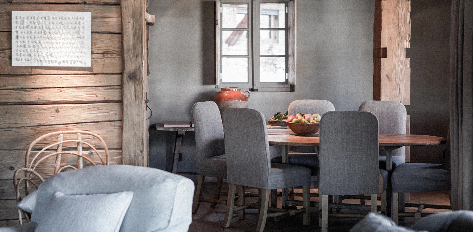 Our apartment-style suite at Le Chalet is a unique 140 m² space accommodating up to 4 guests, the largest suite available. It offers stunning views of the mountains and Megève from its large balcony, making it ideal for a family with children or two couples. On the first floor, the expansive living area centres around an open wood-burning fireplace for maximum comfort after a day on the slopes, with a private dining area and a desk space nearby. Also located on the first floor, the master bedroom includes a king-size bed, a dressing room, and a semi-open bathroom with shower and toilet. On the second floor, the second bedroom includes a king-size bed that can be converted into two twin beds, along with a bathroom with shower and separate toilet. This suite is designed for comfort, relaxation, and shared moments, offering a perfect mountain retreat