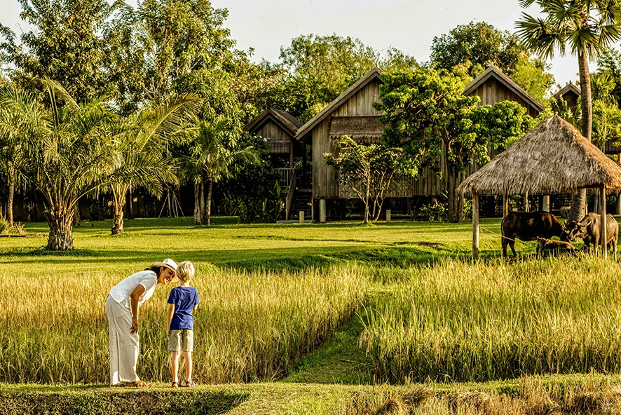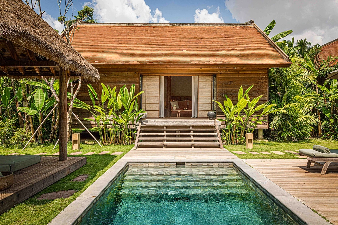 Built on stilts, our one-bedroom Pool Villas feature a spacious 72 sqm interior and a private plunge pool. The outdoor private garden is thoughtfully designed with sun loungers, a thatched-roof sala with daybeds, and a dining table for relaxed open-air living.