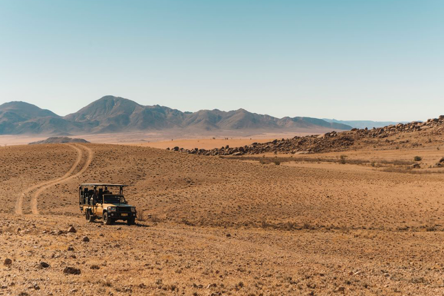 After a leisurely wake-up, depart camp with your guide on an informative journey following a desert track, hemmed between an ancient riverbed on the left and a long red-sand yellow-grass dune on your right. After watching the microlife shake themselves awake with the warming sun, your guide will stop the vehicle and show you the way as you ascend the dune to the top. Turn a full sweep at the apex of the dune in awe, as you drink in an elevated and unimpeded 360° panoramic view of the desert plains, dune and mountains beyond.