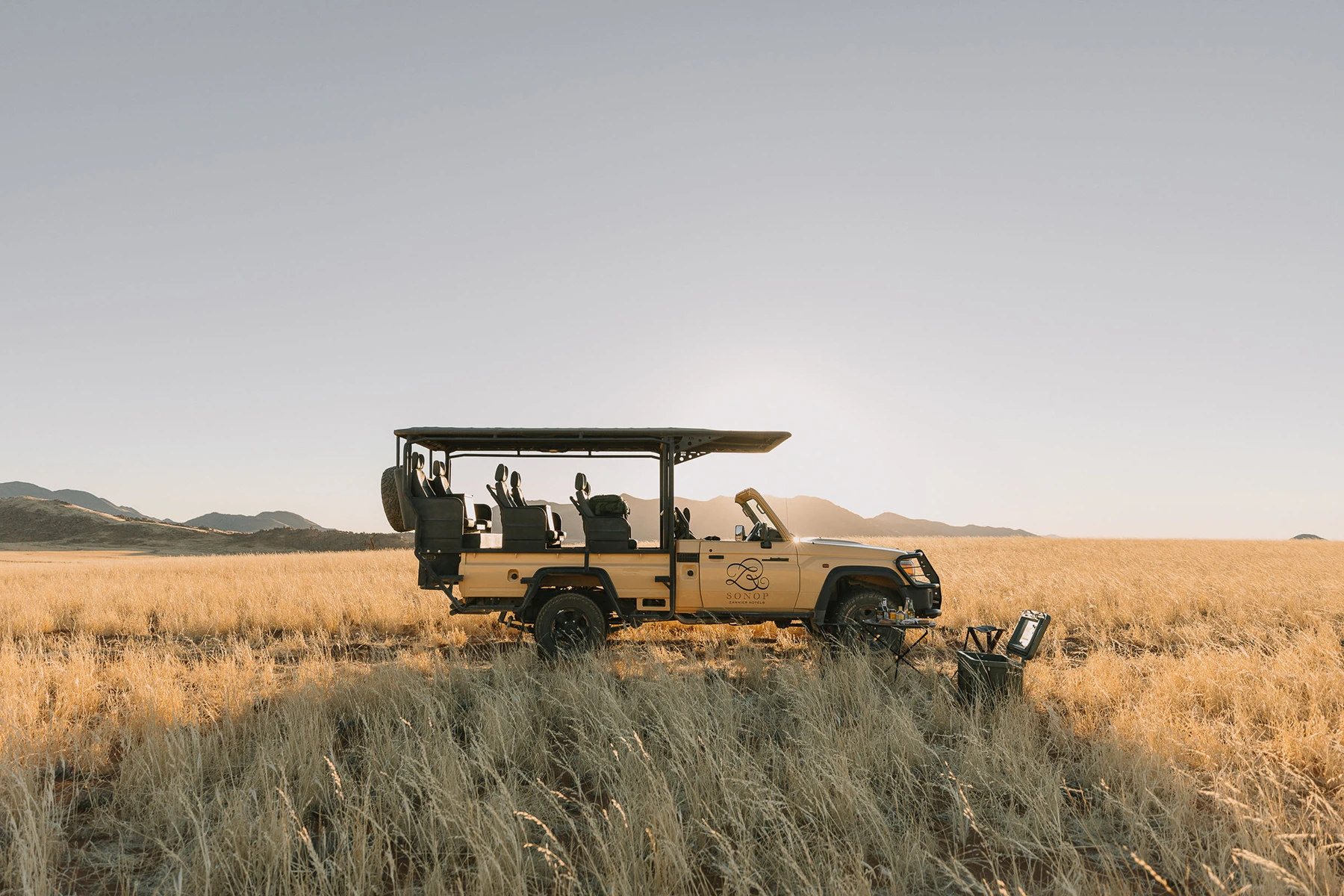 While the landscape transforms with magnificent colour, intensity, and texture as the sun rises, you depart the camp on an immersive journey of desert discovery. Pausing regularly, breathing in what appears to be complete solitude and silence, only to hear the elusive yet definite flurry of life which surrounds you. Noticing the persistent beautiful chirping of the evasive Barking Gecko’s as they signal their territories and feeling the kiss of the refreshing desert air, as you move again effortlessly in the comfort atop one of Sonop’s bespoke Land Cruisers. Every arm and head rested bucket seat is primely located to drink in the panoramic vista of the expansive desert landscape. A secure, dustproof stowage cabinet is conveniently located in between the seats ensuring that your photographic and optical gear is safe, dust-free, and conveniently close.